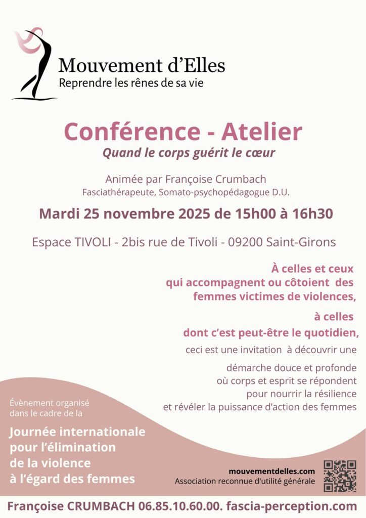 En tant que membre de l’Association nationale « Mouvement d’Elles » reconnue d’utilité nationales, qui fédèrent les praticien-ne-s de Fasciathérapie et de Somato-psychopédagogie qui accompagnent les femmes victimes de violences, et dans le cadre de la Journée Internationale pour l’élimination des violences à l’égard des Femmes, je propose une conférence-atelier, ayant pour objectif de :